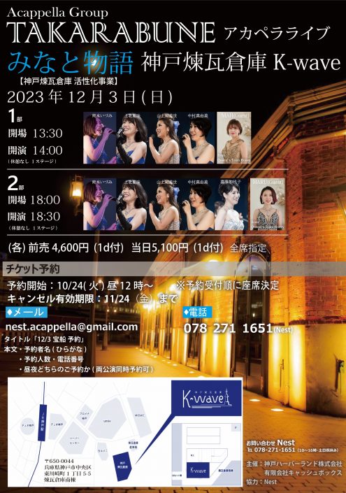 | 12/7 佐藤竹善 Your Christmas Night 2025 Supported by 兵庫日産 12/7 佐藤竹善 Your Christmas Night 2025 Supported by 兵庫日産 12月 7 全日 ![]() [タイトル] 佐藤竹善 Your Christmas Night 2025 Supported by 兵庫日産 [出演] 佐藤竹善(vo.) 青柳 誠(pf)/井上陽介(b)/江藤良人(ds) [日程] 2025年12月7日(日) [開場/開演] 1部 13:15/14:00 2部 16:45/17:30 [料金] 各8,800円(別途Drink代600円) [席] 全自由席 [入場] 整理番号順入場 [支払い] 当日受付にてお支払い(現金のみ) ※お一人様4枚まで。 ※4歳以上有料。 4歳未満は保護者1名につき1名まで 膝上鑑賞無料。 席が必要な場合は有料。 ※キャンセル不可 (前売り料金全額支払いお願いします) [一般発売日(先着)] 2025年9月13日(土) 10:00~ https://tiget.net/events/420969 | 12/11 「フェ+KOBE」 12/11 「フェ+KOBE」 12月 11 全日 ![]() 「フェ+KOBE」 2025/12/11 18:00 OPEN 18:30 START ⚫︎チケット 現地観覧 4000円(+1Drink600円必要) 配信視聴 4000円 各種購入時手数料別途有 ⚫︎出演 PhenoMellowJXJ哲誠矢田佳暉A//FECT 📍神戸煉瓦倉庫K-wave 【チケット販売開始 12/1 21時~】 🎫現地https://t.livepocket.jp/e/ob2e5 🎟️配信https://premier.twitcasting.tv/c:street_harksb/shopcart/408095#フェノメロ | 12/13 タケカワユキヒデ 僕はSINGER ~ XMAS SPECIAL 2025 with 舟山 周 12/13 タケカワユキヒデ 僕はSINGER ~ XMAS SPECIAL 2025 with 舟山 周 12月 13 全日 ![]() タケカワユキヒデ 僕はSINGER ~ XMAS SPECIAL 2025 with 舟山 周公演日:2025年12月13日(土) 時 間:<1回目>open 14:00 / start 14:30 <2回目>open 16:30/ start 17:00 料 金:前売10,000円 当日10,500円(全席指定)※未就学児入場不可 《チケット一般発売日》 2025年10月18日 よりイープラスにて販売開始 配 信:配信予定 | ||||