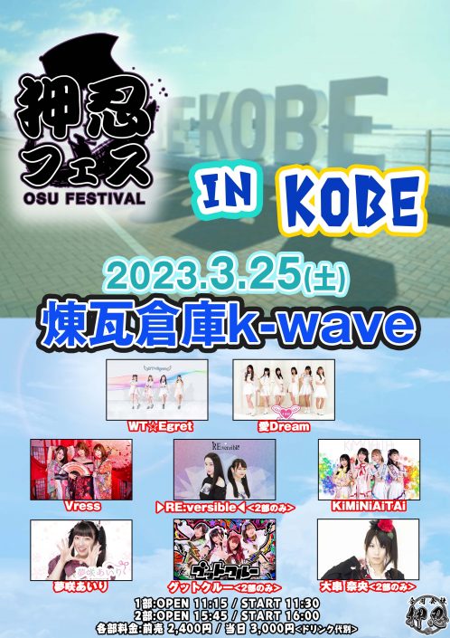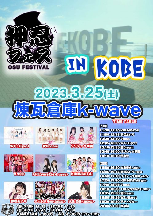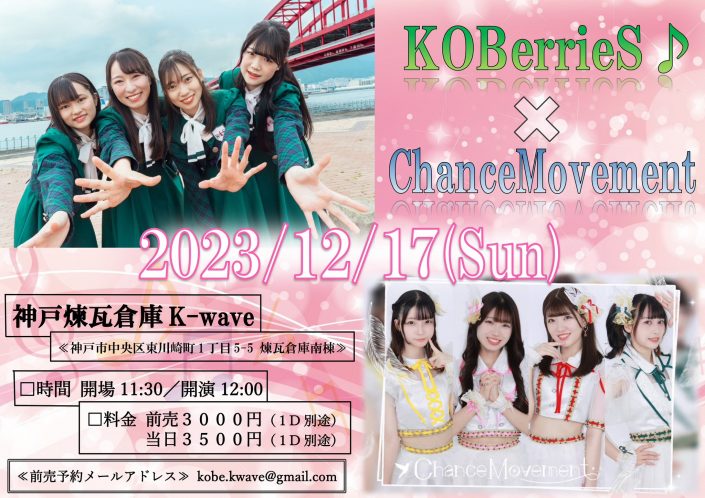 | 12/24 Unlimited tone Xmas eve リリース ワンマンライブ2025 12/24 Unlimited tone Xmas eve リリース ワンマンライブ2025 12月 24 全日 ![]() Unlimited tone Xmas eve リリース ワンマンライブ2025 Unlimited tone 2025年12月24日(水) [開場/開演]18:45/19:30 [料金]S指定席 7,000円(1Drink600円別途必要) / A 指定席 5,000円(1Drink別途必要) ※S指定席は限定30席 [販売・予約] □FC先行販売期間 (※会員番号の入力が必要です) [先行販売受付期間]2025年8月22日(金) 〜 8月30日(土) 23:59 [先行販売当選通知]2025年8月31日(日) 〜 9月1日(月) □一般予約 [予約開始]2025年9月7日(日) 12:00 https://tiget.net/events/424056 | 12/27 夢の3マンライブ 12/27 夢の3マンライブ 12月 27 全日 ![]() 夢の3マンライブ 2025年12月27日(土) 出演:東京力車/KOBerrieS♪/TあんどT 開場:13:30 開演:14:00 チケット価格:前売3000円(1D別途)/当日3500円(1D別途) 全席自由席 【チケット予約】 予約専用アドレス kobe.kwave@gmail.com お名前(フルネーム)/公演日/枚数明記をお願いいたします。 ※お一人様4名までのご予約とさせていただきます ※当日はオープン10分前に入場整理順の抽選をおこないます。 <入場順> (OPEN10分に入場整理順の抽選をおこないます。) 1.抽選整理番号順 2.当日券 | |||||