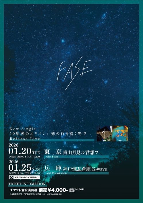 | 1/25 FASE New Single ”10年後のオリオン/ 恋の行き着く先で” 1/25 FASE New Single ”10年後のオリオン/ 恋の行き着く先で” 1月 25 全日 ![]() FASE New Single ”10年後のオリオン/ 恋の行き着く先で” Release Live 2025.1.25(日) 神戸煉瓦倉庫 K-wave 料金¥4,000 / ¥4,500+1ドリンク代600円必要 OPEN / START : 14:00 14:30 配信あり¥2,500 (編成)with Piano&Violin 【イベント特典】 神戸煉瓦倉庫活性化の一環として色んな店舗への周回して頂いた方にプレゼントがあります。 当日、煉瓦倉庫のk-wave以外での他のお店のご利用(1000円以上)でFASEの当日限定特製ポストカードをプレゼント さらに2店舗以上のご利用でサイン付きポストカードをプレゼント!引き換えはk-waveにてレシートをご提示ください。 終演後も引き換え可能です 【対象店舗】 ・オールド・スパゲティ・ファクトリー 神戸店 https://kobe-renga.jp/shop/old-spaghetti-factory/ ・L’INSIEME(リン シ エメ) https://kobe-renga.jp/shop/linsieme/ ・NAGASAWA 神戸煉瓦倉庫店 https://kobe-renga.jp/shop/nagasawa-koberengasouko/ ・FELICE.KOBE https://kobe-renga.jp/shop/felice-kobe/ ・有馬香心堂煉瓦倉庫 https://kobe-renga.jp/shop/arimakoushindo-rengasouko/ 神戸煉瓦倉庫公式ページ https://kobe-renga.jp/ 尚、当イベントに関して神戸煉瓦倉庫 及び店舗へのお問い合わせはご遠慮ください。 1/25 FASE New Single ”10年後のオリオン/ 恋の行き着く先で” Release Live 神戸編 1/25 FASE New Single ”10年後のオリオン/ 恋の行き着く先で” Release Live 神戸編 1月 25 全日 ![]() FASE New Single ”10年後のオリオン/ 恋の行き着く先で” Release Live 神戸編 開場 / 開演 14:00 / 14:30 前売 / 当日 ¥4,000 / ¥4,500 出演 FASE 、Piano 夏未(WALTZMORE) Violin 夏未 プレイガイド TIGET / https://tiget.net/events/449577 その他※チケットはTiGETにて、12/9(火)20:00~予約開始! ※23歳以下学割適用チケット¥2500ー 受付時に学生証ご提示お願いいたします! <入場順> ①TiGET ②手売 ③当日券 【イベント特典】 神戸煉瓦倉庫活性化の一環として色んな店舗への周回して頂いた方にプレゼントがあります。 当日、煉瓦倉庫のk-wave以外での他のお店のご利用(1000円以上)でCooley High Harmonyの当日限定特製ポストカードをプレゼント さらに2店舗以上のご利用でサイン付きポストカードをプレゼント!引き換えはk-waveにてレシートをご提示ください。 終演後も引き換え可能です 【対象店舗】 ・オールド・スパゲティ・ファクトリー 神戸店 https://kobe-renga.jp/shop/old-spaghetti-factory/ ・L’INSIEME(リン シ エメ) https://kobe-renga.jp/shop/linsieme/ ・NAGASAWA 神戸煉瓦倉庫店 https://kobe-renga.jp/shop/nagasawa-koberengasouko/ ・FELICE.KOBE https://kobe-renga.jp/shop/felice-kobe/ ・有馬香心堂煉瓦倉庫 https://kobe-renga.jp/shop/arimakoushindo-rengasouko/ | 1/31 Vocal Circus vol.6 1/31 Vocal Circus vol.6 1月 31 全日 ![]() 2026年1月31日(土) Vocal Circus vol.6 [出演] Synphony/Z/BaLi-OS/ 若宮大起/STAYG [開場/開演] 14:00/14:30 [料金] 有観客 3,500円(1Drink別途600円) [席] 自由席 [入場方法] 予約番号順 ※キャンセル不可 (前売り料金全額支払いお願いします) [支払い] 当日受付にてお支払い (現金のみ) [配信購入ページ] https://premier.twitcasting.tv/c:bank_c_project/shopcart/413350 配信 3,000円(システム手数料160円) |