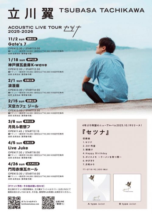| 1/18 立川翼 ACOUSTIC LIVE TOUR 『セツナ』2025-2026 1/18 立川翼 ACOUSTIC LIVE TOUR 『セツナ』2025-2026 1月 18 全日 ![]() 立川翼 ACOUSTIC LIVE TOUR 『セツナ』2025-2026 開 場:12:00 開 演:12:30 チケット:一般前売り 4,000円 中学生以下2,500円 ※未就学児童無料 ※別途1ドリンク代600必要 ※入場は整理番号順となります。 -チケット予約・購入- ■予約開始 12月15日(月)19:00予約スタート ■予約方法 ・LINE LINE『翼便り』宛に【お名前・ご希望の公演名と日付・ご希望枚数】を明記のうえ送信して下さい。 ※翌日までにお支払い方法・チケット受け渡し方法等をお知らせ致します。 ・メール 『office.tsubasa16@gmail.com』宛に、【お名前・ご希望の公演名と日付・ご希望枚数】を明記のうえ送信して下さい。 ※翌日までにお支払い方法等をお知らせ致します。 ・直接販売 12/21のライブ以降は会場でもチケット販売を行っております。 ※LINE・メール予約が優先となります。 | 1/24 優花 presents 「CHERRY JAM FESTIVAL」 1/24 優花 presents 「CHERRY JAM FESTIVAL」 1月 24 全日 ![]() 優花 presents 「CHERRY JAM FESTIVAL」 2026年1月24日(土) 会場: 神戸煉瓦倉庫K-wave 開場16:30 開演17:00 Ticket ¥3500 (+1drink600円) 配信 ¥3000 (+システム料) 出演: 優花/平野里沙/神園さやか/Peco/齋明寺麻里愛/瀧本りおな ———————————— ◇入場順 ①Tiget (予約番号順) ②手売りチケット(整列順) ◇ご予約開始 12/6(土) 17:00 | |||||