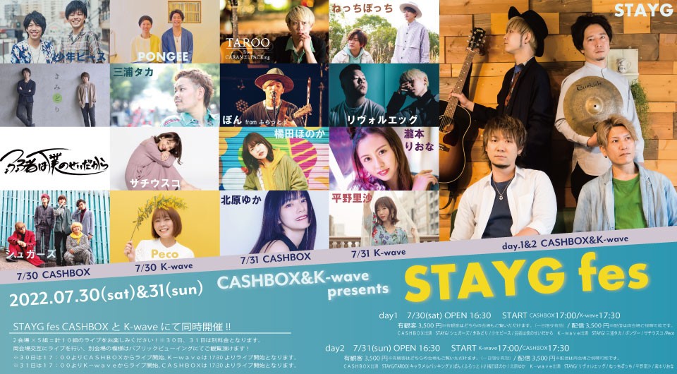 [会場]CASHBOX/K-wave [出演] CASHBOX出演 STAYG/シュガーズ/きみどり/少年ピース/弱者は僕のせいだから K-waev出演 STAYG/三浦タカ/ポンジー/サチウスコ/Peco