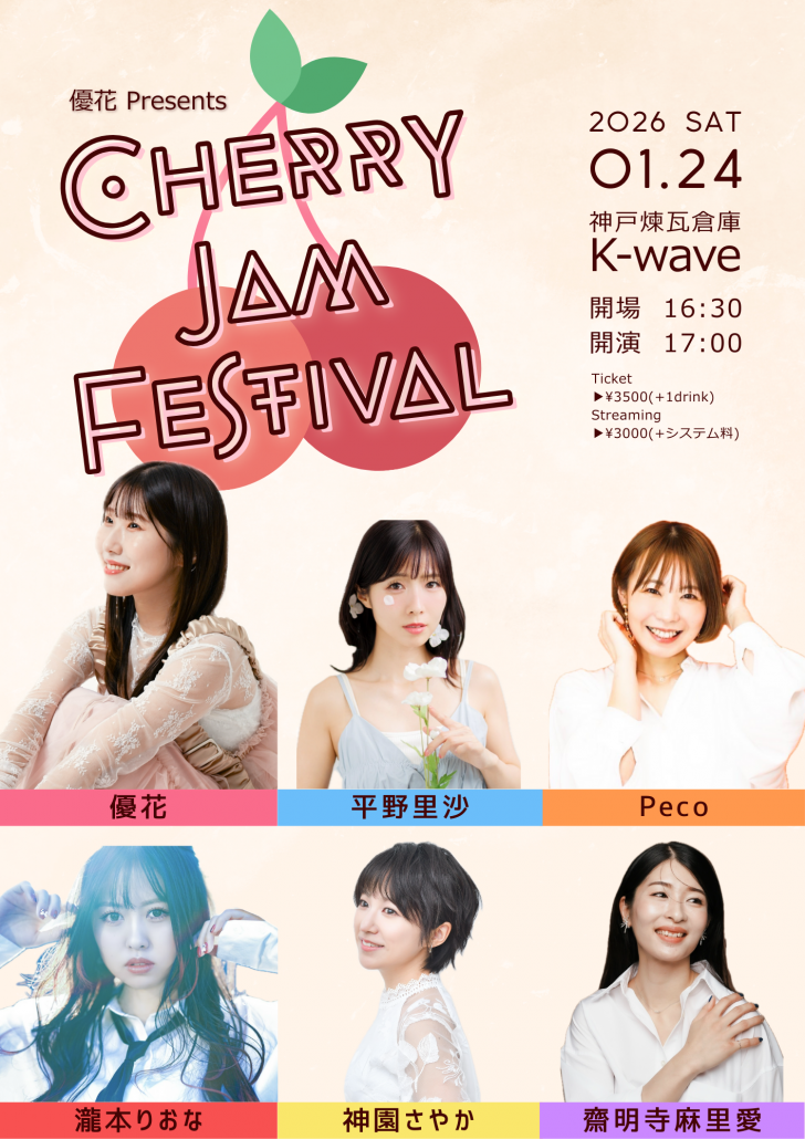 1/24 優花 presents 「CHERRY JAM FESTIVAL」 2025年12月11日/カテゴリ: ALL, EVENT, LIVE /作成者: Manager Calendar カレンダーに追加 Timelyカレンダーに追加 Googleに追加 Outlookに追加 Appleカレンダーに追加 その他のカレンダーに追加 Export to XML いつ: 2026年1月24日 全日 2026-01-24T00:00:00+09:00 2026-01-25T00:00:00+09:00 ALL EVENT LIVE 優花 presents 「CHERRY JAM FESTIVAL」 2026年1月24日(土) 会場: 神戸煉瓦倉庫K-wave 開場16:30 開演17:00 Ticket ¥3500 (+1drink600円) 配信 ¥3000 (+システム料) 出演: 優花/平野里沙/神園さやか/Peco/齋明寺麻里愛/瀧本りおな ———————————— ◇入場順 ①Tiget (予約番号順) ②手売りチケット(整列順) ◇ご予約開始 12/6(土) 17:00