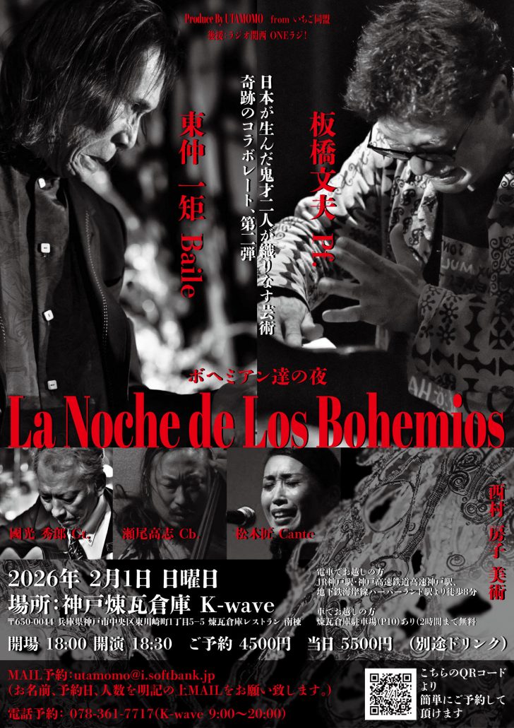 2/1 La Noche de Los Bohemios〜ボヘミアン達の夜〜 2026年1月6日/カテゴリ: ALL, EVENT, LIVE /作成者: Manager Calendar カレンダーに追加 Timelyカレンダーに追加 Googleに追加 Outlookに追加 Appleカレンダーに追加 その他のカレンダーに追加 Export to XML いつ: 2026年2月1日 全日 2026-02-01T00:00:00+09:00 2026-02-02T00:00:00+09:00 ALL EVENT LIVE 2月1日(日) La Noche de Los Bohemios〜ボヘミアン達の夜〜 「日本が産んだ鬼才二人が織りなす芸術。奇跡のコラボレート、第二弾!」 OPEN 18:00 START 18:30 前売 4500円 当日 5500円 (別途ドリンク代600円必要) 出演 東仲 一矩 Baile/板橋文夫 Pf./松木匠 Cante/國光 秀郎 Gt./瀬尾高志 Cb./西村 房子 美術 Produce By UTAMOMO from いちご同盟 後援:ラジオ関西 ONEラジ!